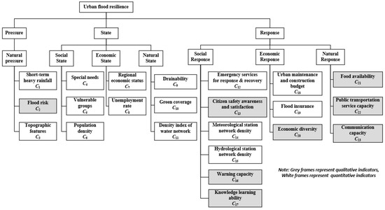Following the outlined conceptual framework and factors identified, an urban flood resilience evaluation indicator system was developed, as depicted in Figure 2.