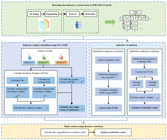The proposed method has four primary steps, as described in Figure 3. First, an urban flood resilience evaluation indicator system is constructed (Section 3). Second, the weights of these indicators are determined using the SW-GAHP method (Section 4.2). Third, methods for evaluating quantitative and qualitative indicators are proposed (Section 4.3). Ultimately, all indicators’ evaluation results are combined using the weighted average operator for NCMs, as described in Section 4.4.