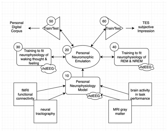 There are, of course, obvious technical challenges to constraining the PNE to fit the person’s neurophysiological activity, as well as their behavior and experience, such that considerable expense and time will likely be required to find out what works. We think that even with considerable limitations in early working prototypes, a PNE could provide an effective two-way interface between the human brain/mind and neuromorphic AI architectures, suitable for creating a digital twin, such as now envisioned for medical, military, or industrial applications [54,55]. In order to emulate the actual brain, the PNE is limited in regard to one functional domain (the brain interface), namely to the architecture of the person’s brain. But, as an AI solution, it may also provide effective information exchanges with various AI resources.