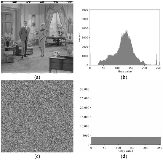 The histogram illustrates the distribution of pixel values within the images. Typically, visually meaningful images exhibit a regular histogram distribution, whereas ciphertext images show an evenly distributed histogram to prevent statistical attacks. Figure 6 illustrates the histograms of the two USC-SIPI database [37] images and their corresponding ciphertext versions (Figure 6). All ciphertext image histograms display uniform distribution and visual similarity, rendering it challenging for potential attackers to extract valuable information through statistical analysis.