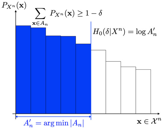 It should be noted that these alternative expressions are simple and easy to understand compared to (19). Figure 1 and Figure 2 show operational meanings of (21) and (22). As in Figure 1, the smooth max entropy is equal to the logarithm of the cardinality of the set with where each of the sequence has large probability. On the other hand, the smooth min entropy is equal to the supremum of such that the sum of probabilities of sequences that exceeds is less than or equal to (Figure 2).