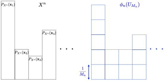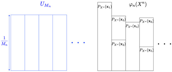 We consider the problem concerning how to simulate a given discrete source by using the uniform random number and the mapping . Figure 3 is an illustrative figure of this problem (the probability distribution for is depicted in black, while the one for is shown in blue). Since it is hard to simulate the exact source in general, we consider the approximation problem under some measure. This problem is called the resolvability problem. One of the main objectives in the resolvability problem is to derive the smallest value of a in the form of , which we call the optimum resolvability rate [1,8]. This is formulated as follows.