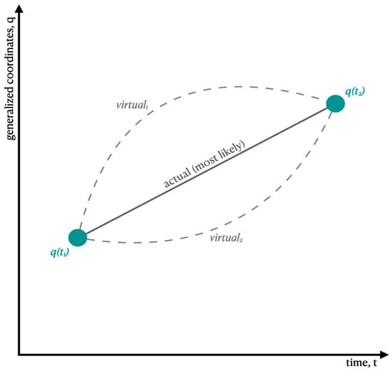 HP states that the motion of a physical system can be determined by finding an extremum of a functional of the Lagrangian. ‘Extremum’ means either a minimum or a maximum, and ‘functional’ means a function of a function, e.g., f(g(x)). A Lagrangian is a function that specifies the physical system’s position coordinates and their rates of change []. Typically, the function of position is identified with the system’s potential energy, and the function of velocity is identified with its kinetic energy. Thus, in classical mechanics, the Lagrangian is equal to the difference between potential energy and kinetic energy which, when integrated over time, defines action. HP applied to classical mechanics usually yields the prediction that the most likely path for a system to take is the one where the action is minimized, which is why it is commonly referred to as the ‘least action principle’ (see Figure 1 for a helpful illustration of these ideas).
