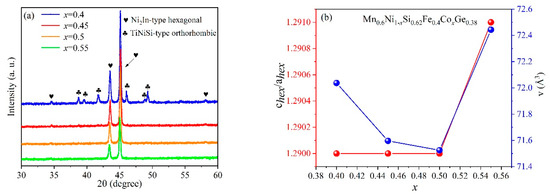 In order to investigate the crystal structure and the content of different phases at 295 K, the Rietveld method was used to carry out full-spectrum fitting lattice refinement (shown in Figure 2a). The chex/ahex and cell volume v for HEAs with different Co-doping levels are shown in Figure 2b. Table 1 lists all structural refinement data. The x = 0.4 HEA contains 98.6% hexagonal Ni2In-type phase and 1.4% orthorhombic TiNiSi-type phase. Another three alloys exhibit 100% hexagonal Ni2In-type phase. The MM’X system alloys undergo the structural transition from hexagonal Ni2In-type phase at high temperatures to orthogonal TiNiSi-type phase at low temperatures. The corresponding lattice constants of hexagonal and orthorhombic structure are shown as follows [29,30]: