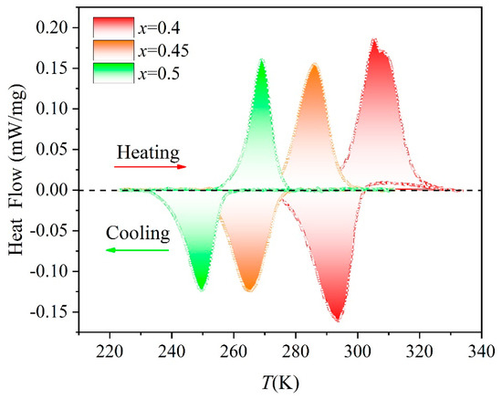 Equation (4) can be used to calculate the latent heat of DSC heat flow curve phase transition and DSC entropy changes () of alloys, which are 56.4 J∙kg−1K−1, 27.3 J∙kg−1K−1, and 24.8 J∙kg−1K−1 for x = 0.4, 0.45, and 0.5, respectively.