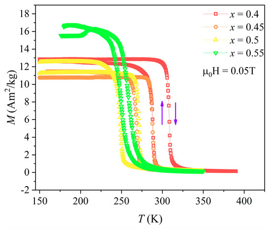 Figure 4 shows the temperature-dependent magnetization curves of Mn0.6Ni1−xSi0.62Fe0.4CoxGe0.38 (x = 0.4, 0.45, 0.5, 0.55) alloys at a magnetic field of 0.05 T. The curves of all alloys in Figure 4 are smooth. For x = 0.40–0.50, the thermomagnetic results show the magnetostructural transformation between ferromagnetic and paramagnetic phases. The TC was obtained as the maximum of the derivative of the thermomagnetic curves during the heating process and was 309 K, 289 K, 272 K, and 259 K. It is clear that TC gradually decreases with the substitution of Co for Ni. The discrepancy between TC in cooling and heating processes is also observed, namely there is thermal hysteresis (ΔThys). By calculation, the ΔThys of x = 0.4, 0.45, 0.5, and 0.55 alloys are 21 K, 20 K, 24 K, and 12 K, respectively. Therefore, TC gradually decreases from near room temperature to below room temperature as the Co content increases.
