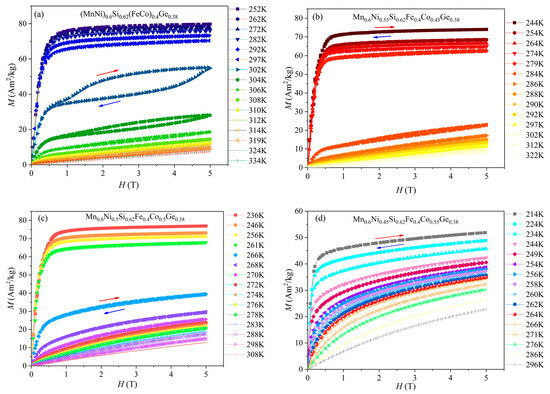 Figure 5a–d show the isothermal magnetization curves of HEAs, with different Co-doping arrangements, near the Curie temperature. All alloys exhibit obvious magnetic transformation with rising temperatures. When the temperature is lower than TC, the isothermal magnetization curves of alloys are ferromagnetic, and the magnetization increases rapidly with the increasing intensity of the magnetic field. The curves turn rapidly at about 1T, and no longer increase when approaching saturation. When the temperature is higher than TC, the isothermal magnetization curves of the alloys show a nearly linear change, which is characteristic of paramagnetic states. The x = 0.4 alloy undergoing first-order phase transition was observed to exhibit a giant magnetocaloric effect in a very limited temperature range, which was accompanied by an obvious magnetic hysteresis. The curves with magnetic hysteresis of x = 0.45 (x = 0.5) are obtained in the temperature range near-phase transition from 279 K to 284 K (261 K to 266 K), which are not shown in Figure 5. For x = 0.55 alloys, the initial magnetization curve and demagnetization were almost identical, indicating that the magnetic hysteresis is almost negligible. This sample undergoes second-order phase transition, which does not show any hysteresis.