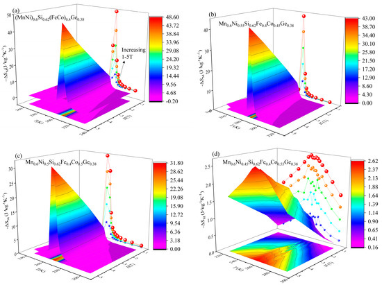 Figure 6 shows the 3D diagram of ΔSM near the Curie temperature of Mn0.6Ni1−xSi0.62Fe0.4CoxGe0.38 with x = 0.4, 0.45, and 0.5 alloys at a magnetic field of 0–5 T. As shown in Figure 6a–d, when the magnetic field intensity reaches 5 T, the maximum isothermal magnetic entropy changes of x = 0.4, 0.45, 0.5, and 0.55 are 48.5 J∙kg−1K−1, 42.9 J∙kg−1K−1, 31.7 J∙kg−1K−1, and 2.6 J∙kg−1K−1, respectively. The x = 0.4, 0.45, and 0.5 alloys have a giant ΔSM, showing the characteristics of FOPT. The alloy x = 0.55 has a small isothermal magnetic entropy change, which is characteristic of second-order phase transition (SOPT) materials. The mechanism of the phase transition will be analyzed later.
