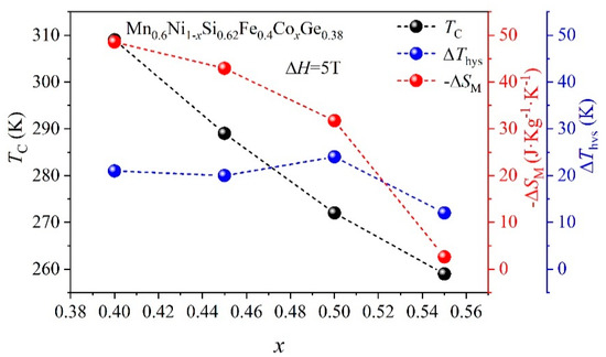 Figure 3 shows the heat flow curves of the HEAs with different Co-doping arrangements are near the Curie temperature (TC). It is observed that endothermic peaks appear near the TC of alloys x = 0.4, 0.45, and 0.5, and the corresponding peaks are 306 K, 286 K, and 269 K, respectively. However, neither endothermic peaks nor exothermic peaks observed in Figure 3 appear in alloys x = 0.55, which is due to the fact that Ttr is outside the operational range (183–400 K) of DSC. It is suggested that Co substitution stabilizes the Ni2In-type phase, which shifts the phase temperature of structure to a lower temperature. The decreasing structural transition temperature with the substitution of Co for Ni is attributed to the strengthening covalent bonding between neighboring Mn-Mn atoms [34,35,36]. Therefore, it may be a sufficient method to tailor the Ttr to the Curie temperature window and then achieve the magnetostructural transition. The DSC heat flow curves of x = 0.4, 0.45, and 0.5 alloys show that the transition temperature Ttr is lower than the Curie temperature TC. Thus, the magnetic and structural coupling of the three alloys occurs, resulting in a giant magnetocaloric effect.