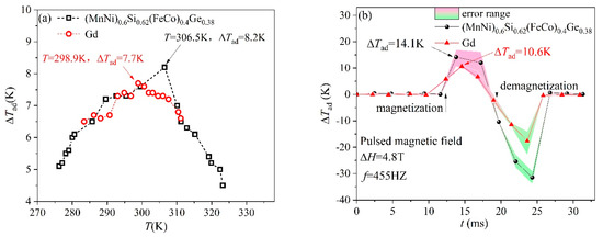 Adiabatic temperature change (ΔTad) is another noteworthy physical property of magnetocaloric alloys. ΔTad shows the temperature change when materials enter and leave the magnetic field, measuring the heat transferred from the cold to the hot side of the prototype. In order to obtain the actual ΔTad of the material, the x = 0.4 HEA was tested using a self-developed PPMS-based adiabatic temperature change direct measurement device. The curves of adiabatic temperature for Ga and x = 0.4 HEA, with a superconducting magnetic field at 5 T and a pulsed magnetic field at 4.8 T, are shown in Figure 8a and Figure 8b, respectively. With the gradually increasing temperature, the ΔTad of the sample first increased and then decreased, reaching a peak value of 8.2 K at about 306.5 K (very close to the TC = 309 K). Meanwhile, as a comparison, the maximum ΔTad of Gd is 7.7 K at 298.9 K, which is very close to the value reported in the literature [37]. The measured ΔTad of Gd and x = 0.4 HEA under a 4.8 T pulsed magnetic field are 10.6 K and 14.1 K, respectively. Compared to previous research into magnetocaloric materials, such as HoDyB2 [38] with a reversible temperature change of about 1.1 K at 1.93 T and Mn1.15Fe0.8P0.5Si0.5C0.05 [37] with an adiabatic temperature change of about 3.61 K at 5 T, x = 0.4 HEA without rare earth shows a promising magnetocaloric material for application. The applied magnetic field model might lead to different response behaviors for MCE materials, which is consistent with the reported results [39].