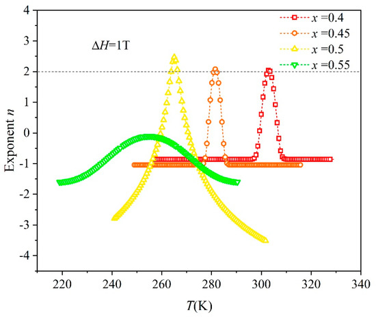 The law exponent n curves obtained after nonlinear fitting of a Gaussian function are shown in Figure 9. For nmax < 2, the alloy of x = 0.55 belongs to SOPT materials with very small isothermal magnetic entropy, indicating that it exhibits small MCE. In contrast, the x = 0.40, 0.45, and 0.50 alloys for nmax > 2 belong to FOPT materials, which are consistent with the experimental results.