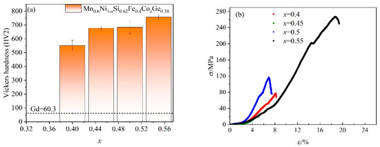 The Vickers hardness and compression performance of Mn0.6Ni1−xSi0.62Fe0.4CoxGe0.38 samples with different Co-doping were investigated, as shown in Figure 10a and Figure 10b, respectively. The Vickers hardness values of the HEAs with different Co-doping are 552 HV2, 677 HV2, 683 HV2, and 758 HV2. The compressive strength of Mn0.6Ni1−xSi0.62Fe0.4CoxGe0.38 (x = 0.4, 0.45, 0.5, 0.55) alloys are 78 MPa, 21 MPa, 117 MPa, and 267 MPa, as shown in Figure 10b. The reason why the hardness of the alloys increases gradually with the substitution of Co for Ni is related to the order of the phase transition. According to the results obtained from law exponent curves, the x = 0.4, 0.45, and 0.5 alloys underwent severe FOPT from hexagonal structures to orthorhombic structures, in which a certain amount of internal stress was generated. In contrast, the x = 0.5 alloy exhibited SOPT from paramagnetic phase to ferromagnetic phase without lattice distortion. Therefore, the x = 0.5 alloy exhibits better mechanical properties compared to x = 0.4, 0.45, and 0.5 alloys.