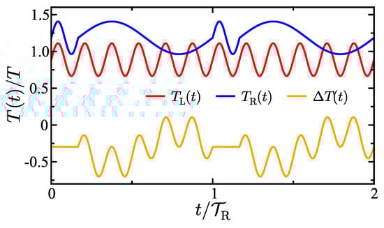 Time-dependence of the left and right bath temperatures and the temperature difference between them. The temperatures are shown in units of T and time is shown in units of . Parameters are (, ), , , , , , , . All parameters throughout the article are given in reduced units with characteristic dimensions: , , , and .