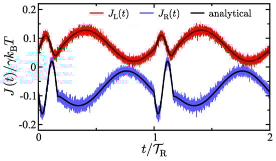 Figure 2 shows a comparison between the theoretical results for the energy fluxes of the two baths and the corresponding results generated using molecular dynamics simulations of the system. The energy flux results from the molecular dynamics simulations are generated by applying the stochastic energetics formalism [,] to trajectories obtained by integrating Equation (1) using the Euler–Maruyama scheme. The total number of trajectories generated was . Excellent agreement is observed between the analytical results and the simulation results. Also observe that due to the piecewise temperature in the right bath, the energy fluxes are continuous but not smooth, having apparent derivative discontinuities at the points in time where the oscillation frequency is switched. Overall, this result supports the validity of the derived theoretical expressions.