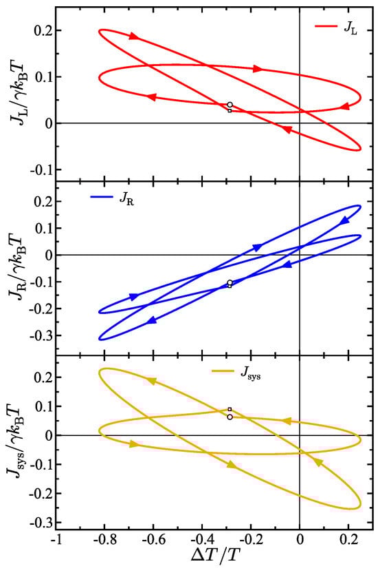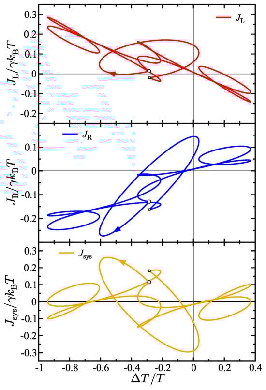 The time-dependence of the temperature gradient gives rise to heat transport hysteresis effects. This means that depending on the time in the oscillation period, the same temperature difference can generate different energy flux values. Heat transport hysteresis is observed when the energy flux generated by a temperature gradient that is oscillating in time is out of phase with the oscillation pattern of the gradient itself. Figure 3 shows the energy fluxes in the model in the plane where both the energy fluxes J and the temperature difference depend on time. Specifically, each panel in the figure shows the energy flux in the left bath (top), the right bath (middle), and the system (bottom) as a function of the time-dependent temperature difference between baths . The starting point of each hysteresis loop is denoted by a circular marker—this is the start of the oscillation period . The presented results in Figure 3 are for the case when only the right bath is oscillating and the left bath temperature is static, so there are two primary frequencies in the model. Correspondingly, two prominent curves can be observed in the hysteresis curves, one for each of the two frequencies. All the energy fluxes start on one of the two prominent curve shapes in the figure, then, when the frequency is switched (shown by the knee in the curve and denoted by a small square marker), the energy flux switches to the other curve. However, the motion is continuous and periodic overall and at the end of the total period the energy flux returns to the starting point denoted by the larger circular marker. This is observed in the left and right bath hysteresis curves as well as for the system.