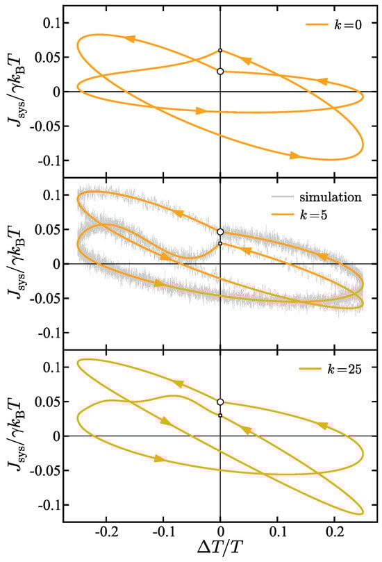 Figure 5 illustrates how changing the force constant in the harmonic potential can affect the hysteresis curve shape. The panels from top to bottom show the energy flux hysteresis curve for (top), (middle), and (bottom). The primary observation is that changing the force constant gives rise to different hysteresis shapes and geometries. As the force constant is increased, the knee in the curve (the point where the frequency shifts in the middle of the overall period) becomes less pronounced. In fact, for , the knee is difficult to identify, signifying that the the curve is approaching smoothness. The results of molecular dynamics are shown in the panel (the middle panel). Two observations are of note: (a) The simulation results are in excellent agreement with the analytical results suggesting the validity of the derived energy flux expressions, and (b) it can be observed that the density of sampled points in the noisy simulation results is larger on some parts of the curves but smaller on others. This is because the simulation results are sampled at a fixed time interval ( and so for the lower frequency part of the frequency-switched hysteresis curves the sampling density is higher. Then, when the frequency switches to a higher frequency, the sampling density becomes lower. It is also interesting to note by comparing each panel in the figure that varying the force constant does not just change the width and length of the curve, but changes its overall shape; for example, it can be observed by comparing the shape of the curves across force constants in the upper left quadrant, that the concavity of the curve changes as the force constant is altered. The cause of this effect is that when another frequency is effectively introduced into the system. This frequency is the frequency of the harmonic potential. Therefore, a complex interplay of phases, frequencies, and oscillation patterns arises between the bath oscillation frequencies, the frequency of the harmonic potential, and the frequencies characterized by the system-bath coupling terms for each bath.
