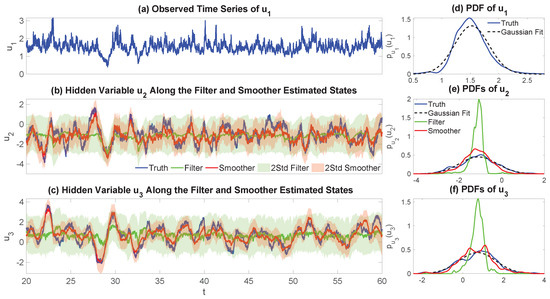 Closed-form solutions for DA are rarely available for general CTNDSs due to their nonlinear dynamics and non-Gaussian statistics, especially for sampling and estimating the latent dynamics. As a result, numerical methods such as the ensemble Kalman filter (EnKF) and particle filter have been developed for nonlinear or non-Gaussian systems [20,21,54,55,56], along with their smoother counterparts [57,58]. These methods are widely used across various scientific disciplines and are essential for ensemble forecasting in operational systems [59,60,61]. However, simulating high-dimensional CTNDSs is computationally expensive, limiting the number of ensemble members or particles that can be used, which can introduce a nontrivial bias and instability in the state estimates (such as finite-time blowup of the solution) [62,63], with the number of samples needed to address these stability concerns increasing at an exponential rate [64]. Techniques like noise inflation, localization, and resampling help address these issues, but they are often empirical and lack natural integration into the state estimation framework [54,65,66,67]. Furthermore, as inherently approximate in nature, the careful study of the accuracy of these pro tem approaches is warranted. Thus, closed-form analytic methods are preferred for enhancing not only the computational efficiency and numerical behavior of probabilistic state estimation, but also for promoting the accurate capture of the salient non-Gaussian features of the dynamics, e.g., intermittent extreme events, and also in facilitating the theoretical study of the model error, as well as the uncertainty in the estimated state.