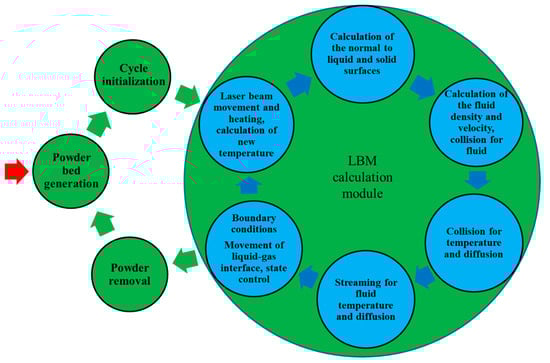 The second internal circuit of the algorithm (shown in blue inside the ‘LBM calculation module’) performs one cycle of the PBF process. Operations are multiple repeated according to the presented sequence, which contains the laser beam movement, heating, and calculation of the new temperature, calculation of normal to the liquid and solid surfaces, calculation of the fluid density and velocity, collision for fluid, heat flow and diffusion, streaming for fluid, heat flow and diffusion, boundary condition, and movement of the liquid–gas interface.