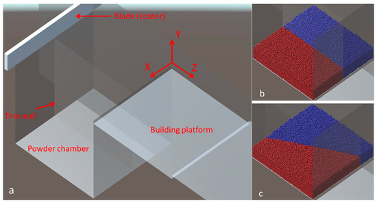 The Unity-based model was presented in [19,21]. This model was created by using the publicly available Unity game engine (https://unity.com, accessed on 20 December 2024). This model is modified to simulate the deposition of the powder of two materials. The modeling scene created in Unity is presented in Figure 3a. The primary elements of the scene are a powder chamber with parts separated by a thin wall with different powders, building platform, and coater. The Unity coordinates set is also presented. The thin wall can rotate around the vertical axes (axes Y) located in the center of the powder chamber (supply platform). A rotation angle is set before filling parts of the chamber with powder of different materials. The floor of the chamber can move vertically at the chosen level. The coater can then move horizontally along the Z axes, distributing the powder on the building platform. After that, the coater returns to the initial location. Finally, the floor of the building planform goes downward to the height of one layer, and the cycle with the movement of the floor of the powder chamber, the blade of the coater, and the floor of the building platform can be repeated. Two cases of filling of the powder chamber are also presented in Figure 3. The thin wall separating the parts of the chamber can either be rotated or not (Figure 3b). In the second case, this wall is rotated at an angle of 25° (Figure 3c). After rotation, the parts are filled with the appropriate powder material. The sizes of the powder chamber and the building platform are the same and equal to 25 × 25 mm in the Unity model, which represents the real domain of 1250 × 1250 μm. This means that the Unity model is created on a scale of 20:1 to respond to the real domain.