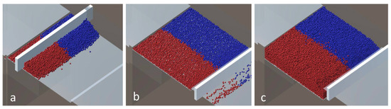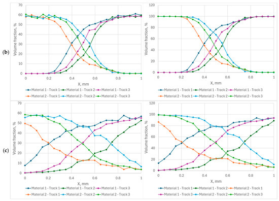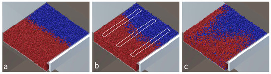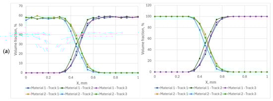Some deposition results as a material distribution are presented in Figure 9. The left column represents the distribution before simulation of the PBF process. The volume fraction of the materials is in the range of 55–62%; the rest is occupied with gas. After the process, there is no gas and the total fraction of materials reaches 100%. The results before and after the process are almost the same; the error can be treated as a small random error. A transient zone from one material to another spreads from 0.25 mm for the angle of 0° through approximately 0.4–0.5 mm for the angle of 25° to the entire modeling space for the angle of 45°. The distribution is almost the same for different locations of the tracks for the rotation angle of 0° (Figure 9a); it can also be seen in Figure 4 and Figure 5a. The increase in the rotation angle (Figure 9a,c) allows the transient zone to spread, but the difference in its location and length become uncontrolled. The heterogeneity of the distribution can also be seen in Figure 5b,c. There are several factors that influence the results obtained in the simulations. Even if the other conditions are the same, it depends on which powder is scraped first with the coater blade. In addition, smaller particles are deposited first; this is especially important when the average size of powder particles of different materials is different. The higher density particles are deposed first in one layer and go deeper when they are deposed in several layers without melting, but in the case of the materials presented in this paper, the density of the materials is almost the same, and this factor does not play a notable role. The influence of the friction coefficient on the deposition is also noticed, but it is difficult to formulate.