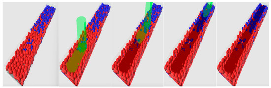 The results of one of the simulation cases of the PBF process are presented in Figure 6, Figure 7 and Figure 8. Figure 6 presents a process as the 3D perspective view with a rendering at five moments of time. The left snapshot presents the initial particle deposition before the PBF process transferred from the Unity-based model. The next three snapshots present three moments of time during the processing of one track—at the beginning, middle, and end of the track. The last snapshot demonstrates the track after the whole material is solidified. Unprocessed particles are shown in grades of red and blue. Solidified material is shown in dark colors, with the fractions of red and blue corresponding to the fractions of the first and second materials. Materials in the liquid state are shown in color as solidified materials but with the addition of green grade. The laser beam is shown in green.