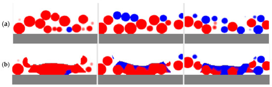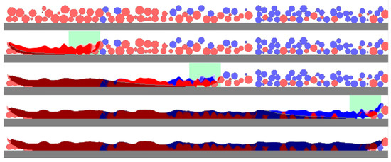 Other results are presented in Figure 7 and Figure 8. They show the materials before and after the PBF process as a longitudinal cross section on the track axis and three transverse cross sections located at the center of the modeled space and at the distance of 300 μm on both sides of the center. Unprocessed particles on the longitudinal cross sections (Figure 7) are shown in lighter colors; solidified materials are shown in deeper colors (red and deep blue); and a mixture is shown in an appropriate fraction of red and blue. Overheated molten material can melt some particles completely or partially and flow beneath them, filling the pores between unmolten particles. The flowing material initiates mixing, which also involves diffusion. However, for the single track on the microscale, in which the simulations with LBM were performed, highly mixed areas occupy only a small fraction, especially when cross sections are considered. Near the surface of the melting pool, the mixing is much higher than near its bottom. The higher mixing can be seen in the 3D view (Figure 6). This can be explained by the higher flow velocity and the additional fast stirring along with the slow diffusion. Near the bottom, the temperature is lower, the viscosity is lower, and the processes of stirring and diffusion are slower; the modeling results reflect this. Unprocessed and solidified materials are shown in the same colors on the transverse cross sections (Figure 8).