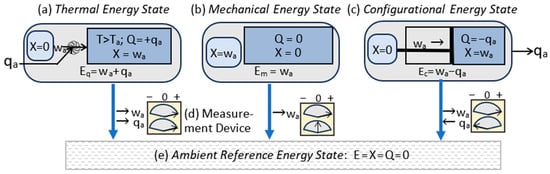 Each system’s energy state in Figure 2 is defined by the exchanges of ambient work and ambient heat with an ambient measurement device as the system reversibly transitions back to the ARS. The three energy states in Figure 2 have the same exergy, equal to the applied work. They differ in whether their energy is mechanical-state energy Em, with Q = 0; thermal-state energy Eq, with Q > 0; or configurational-state energy Ec, with Q < 0.