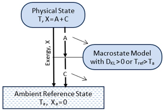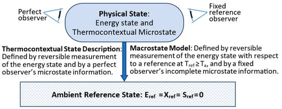| Energy state | Defined by ambient temperature and by reversible measurements of thermally equilibrated system’s temperature, energy, and exergy with respect to the ARS. | |