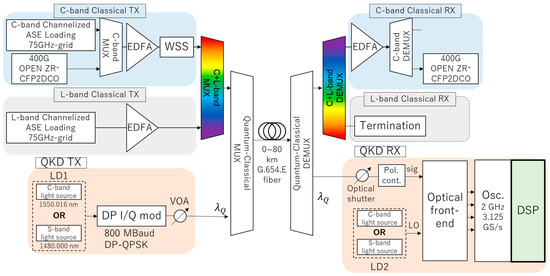We co-propagate a C-band or S-band CV-QKD signal with C-band 63λ or 64λ and L-band 60λ 75-GHz WDM classical signals over 0, 20, 40, 60, and 80 km G.654.E fiber links. The spectrums of the WDM classical signals with the Quantum–Classical multiplexing (MUX) filters are in Figure 3. The classical signals are generated by using channelized Amplified Spontaneous Emission (ASE) loadings. The classical signals are amplified by an Erbium-Doped Fiber Amplifier (EDFA) and then launched into a transmission line. Although the power of the WDM classical signals should be small to minimize the effect of the QKD performance, the post-FEC BER of the classical signals must be zero for the coexistence of quantum and classical signals. For measuring the BER of the classical signals, we multiplexed a C-band CFP2-DCO transceiver signal with the WDM signals and set each C-band/L-band with a launch power of +16 dBm and a total launch power of +19 dBm (−1.9 dBm/ch). We set the transceiver’s wavelength to 1532.779 or 1564.572 nm, which is the 5λ inside the top or the bottom of the C-band. We confirmed that the post-FEC BERs are zero over 0~80 km, which means there is no degradation of the quality of classical signals due to WDM. We use an add/drop filter for MUX and demultiplexing (DEMUX) the quantum and the classical WDM signals. The C-band Quantum-Classical MUX filter exhibits a band-stop profile with a 3 dB bandwidth of 87 GHz and an isolation of 25 dB within the quantum signal band, sufficiently suppressing QKD in-band ASE lights. Similarly, the C-band Quantum–Classical DEMUX filter has a band-pass profile with the same bandwidth and an isolation of 40 dB, effectively attenuating out-of-band classical signals. We use S/C/L-band 3port WDM filters as the S-band Quantum–Classical MUX and DEMUX filters. The central wavelength of these S-band MUX and DEMUX filters is 1490 nm, the bandwidth is 5.4 THz ( nm), and the isolation is 30 dB.