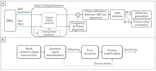 We carried out quantum signal demodulation via offline DSP, as shown in Figure 2a. This includes clock timing extraction, alignment of the frequency and the phase difference between LD1 and LD2, and alignment of the phase difference between the quantum and reference signals. The clock timing extraction is achieved using the feedforward-based method [11]. We estimate the timing offset of the quantum signal from the reference signal and control a digital timing corrector to adjust the clock timing. The optical shutter at the input of the QKD RX is used for shot noise calibration. When the shutter is open, the detected digital signals are demodulated by the DSP, and the variance of the quantum signal is obtained. When the shutter is closed, the detected digital signals pass through the DSP, and the variance of the shot noise is obtained. During one shutter cycle, we can measure one excess noise by comparing the variance of the shot noise and that of the quantum signal. We set the variance calculation block size to 104 bit. The sifted key generation efficiency is 0.25 because we use half of the measurement time to demodulate the quantum signal and the other half to calibrate the shot noise, and we use 50% of the demodulated quantum signal data for sifted key generation and the other 50% for excess noise estimation. The QKD TX and RX share the secret keys after applying error correction and privacy amplification to the sifted keys, as in Figure 2b. Note that excess noise critically affects the CV-QKD performance because the parameter is used to estimate the amount of information leaking.