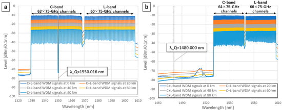 (a) C+L-band WDM signals with the C-band Quantum–Classical MUX filter. (b) C+L-band WDM signals with the S-band Quantum–Classical MUX filter.