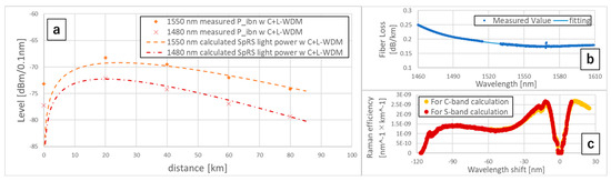 where is the Planck constant, and is the velocity of light. In Figure 6b,c, the measured with the WDM condition generally corresponded to the theoretical , suggesting that under the C+L-band WDM condition, the QKD in-band noise power dominantly affects the excess noise; other factors such as shot noises generated in C-band or L-band WDM signals [16] are negligible for the excess noise. In other words, we clarified that the S-band CV-QKD performance limiting factor under the C+L-band WDM condition is the QKD in-band noise power, dominated by SpRS lights, similar to the C-band CV-QKD performance limiting factor. From this suggestion, we can say that calculated by the SpRS light power is the best under the WDM condition because the excess noise of the ideal QKD TX and RX is zero except for the excess noise caused by WDM classical signals. We plotted the calculated by the SpRS light power with the C+L-band WDM (as shown by the dotted curves in Figure 6a) for estimating the wavelength dependency of the best SKR.