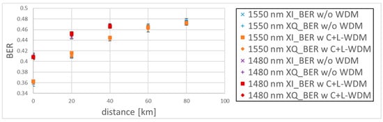 We demodulated the quantum signal in the following four conditions: = 1550.016 nm without WDM, = 1550.016 nm with the C+L-band WDM, = 1480.000 nm without WDM, and = 1480.000 nm with the C+L-band WDM. The power of the quantum signal at the QKD TX was −73.7 dBm, corresponding to the mean photon number of 0.4. We succeeded in demodulating the C-band quantum signal at the transmission distances 0, 20, 40, 60, and 80 km, but our QKD RX could not demodulate the S-band quantum signal at the transmission distance above 60 km, even without WDM, owing to the high loss of the S-band. We plotted the BERs of the C-band and S-band quantum signal in Figure 5 with the standard deviations, showing no significant difference between the BER without WDM signals and the BER with WDM signals. The BER of the S-band quantum signal was worse than that of the C-band quantum signal because of the high loss of the S-band.