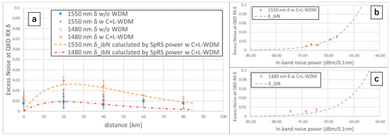 We measured the , the excess noise at the QKD RX, by comparing the variance of the demodulated quantum signal and that of the shot noise in the above four conditions. We measured the five times on the variance calculation block size of bit and plotted the mean with the standard deviations in Figure 6a. In Figure 6b,c, under the C+L-band WDM condition, we plotted the measured of = 1550.016, 1480.000 nm by the on the dots and plotted the theoretical by the on the dotted curves. The is calculated only by the QKD in-band noise power [15], which is given as follows: