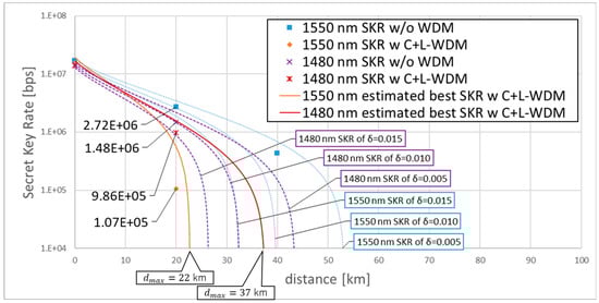 We plotted the SKRs (as shown in Figure 7). The six dotted curves in Figure 7 are the SKRs of = 1550.016, 1480.000 nm by the three fixed (0.005, 0.010, 0.015), showing that excess noise critically affects the CV-QKD performance. The dots in Figure 7 are the SKRs by measured of Figure 6a. At the transmission distance of 20 km, the SKR of = 1550.016 nm without WDM was bps and degraded to bps by the C+L-band WDM signals, the SKR of = 1480.000 nm without WDM was bps and degraded to bps by the C+L-band WDM signals. This result showed the feasibility of our S-band CV-QKD system in distributing secret keys even under the C+L-band 9.30-THz wide bandwidth and +19 dBm high-power WDM conditions. Under the WDM condition, the S-band SKR was much higher than the C-band SKR, showing the advantage of the S-band CV-QKD under the WDM condition. The two solid curves in Figure 7 are the best SKRs estimated by the , which is calculated by the SpRS light power, showing that the maximum secret key distributing distance of = 1550.016 nm under the C+L-band WDM condition was around 22 km, and the of = 1480.000 nm is around 37 km.