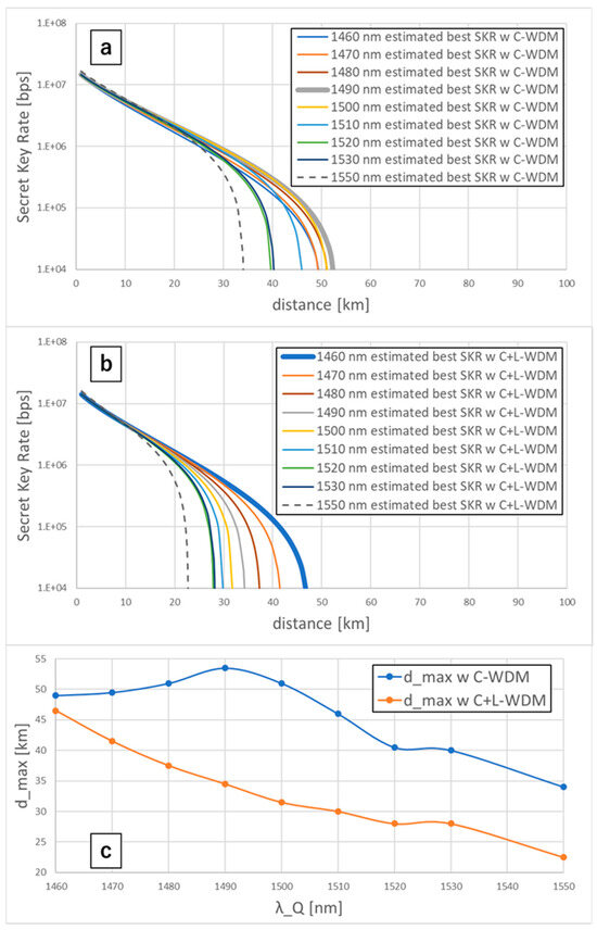 To establish the QKD wavelength design method under the WDM condition, we estimated the best SKRs in the S-band ( = 1460~1530 nm) from the wavelength dependency of the fiber loss and the calculated by the SpRS light power under the C-band WDM condition of the +16 dBm 64 × 75 GHz channels and the C+L-band WDM condition of the +19 dBm 124 × 75 GHz channels. We plotted the best SKRs estimated by the transmission distance (as shown in Figure 8a,b). We measured the as the distance at which the SKRs are below bps. We plotted the of = 1460~1530 nm using the (as shown in Figure 8c). In Figure 8c, the under the C-band WDM condition increased with the shorting of the , reaching the maximum value at 1490 nm and then decreasing. On the other hand, the under the C+L-band WDM condition monotonically increased with the shorting of the . This shows that the optimal QKD wavelength depends on classical WDM conditions. When the total WDM power is high (e.g., under C+L-band WDM conditions), the intense SpRS light induced by the WDM signals dominantly affects the SKR rather than the high fiber loss, so the best SKR can be obtained by allocating the QKD wavelength to minimize the SpRS light power. When the total WDM power is not high (e.g., under C-band WDM conditions), the best SKR can be obtained by controlling the trade-off relation between the SpRS power and fiber loss. The difference between under the C+L-band WDM condition and that of the C-band WDM condition decreased with the shorting of the , and they almost corresponded at 1460 nm, suggesting that the SpRS light induced by the L-band WDM signals decreased with shorting the and became almost zero at 1460 nm. This suggestion is supported by the results illustrated in Figure 4c, which shows that the Raman efficiency of the fiber decreases sharply below the wavelength shift of −110 nm. We confirmed the advantage of the S-band QKD compared to the C-band QKD under the C+L-band WDM condition; using QKD wavelength design, we can make the CV-QKD performance under multi-band (C+L-band) WDM conditions comparable to the performance under single-band (C-band) WDM conditions.