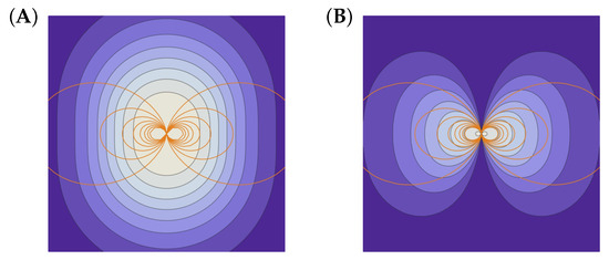 (A) The equilibrium on the leaf defined by . (B) The equilibrium on the leaf defined by and . Contours: Density distribution of magnetized plasma in the neighborhood of a point dipole. Curves: Magnetic field lines (level sets of ). See [14].