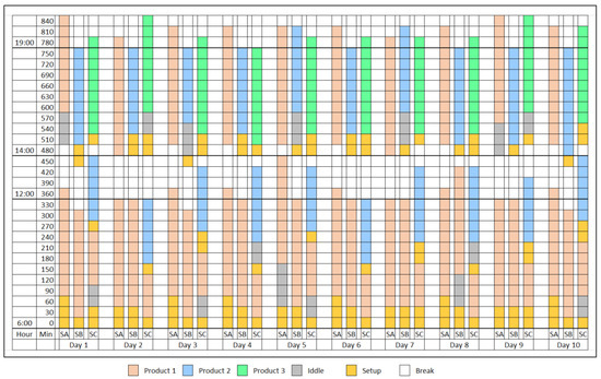 Figure 2 presents the simulation of a manufacturing system operating for 10 days, organized in three stations: SA, SB, and SC. Each station manages production depending on the type of product; the system is observed systematically at 30 min intervals, from 6:00 to 19:00. The SA station focuses mainly on the production of Product 1 (P1), while the SB station alternates between the production of Product 1 (P1) and Product 2 (P2). The SC station processes all three products (P1, P2, and P3). In addition to the production periods, the figure details idle times (Idle), machine configurations (Setup), and breaks (Break), which provides a complete view of the daily operation. The colors allow differentiating each product, highlighting regular patterns in production, such as the consistency of SA in manufacturing Product 1 and the operational diversity in SC.