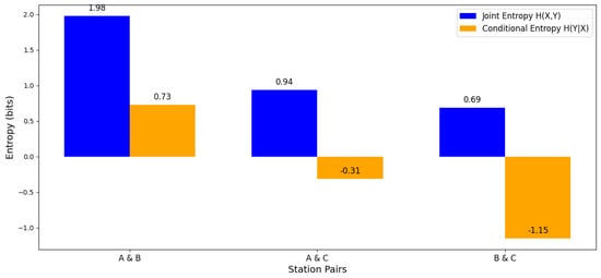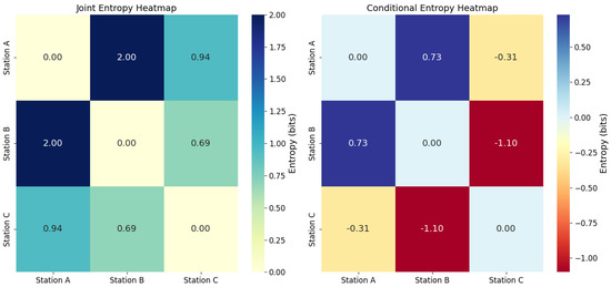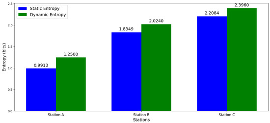 Figure 3 compares the static and dynamic entropy for each station, where Station A shows a noticeable increase in dynamic entropy compared to static, indicating that the temporal variability at Station A adds complexity to the system. Station B and Station C also have higher dynamic than static entropy, suggesting that the temporal dynamics at these stations are more complex than the static structure.