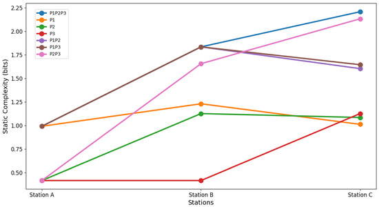 The scenario with the lowest total complexity is the P3 only production, with only 1.9568 bits in total, highlighting a significant reduction in all stations, especially in Station A and B, where complexity remains at 0.4154 bits each. This result suggests that specialization on a single product, particularly one that involves fewer operations, can be an effective strategy to reduce static complexity.