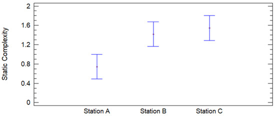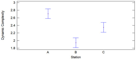 The plot of means with Fisher LSD 95% confidence intervals for dynamic complexity at Stations A, B, and C shows statistically significant differences between station means. Station A has the highest mean dynamic complexity, followed by Station C, while Station B has the lowest mean. The confidence intervals do not overlap, indicating that the differences in dynamic complexity between stations are significant. This suggests that each station faces different levels of operational complexity, reinforcing the need to adopt customized strategies to optimize efficiency at each station. These results corroborate the hypothesis that dynamic complexity varies significantly between stations (see Figure 10).
