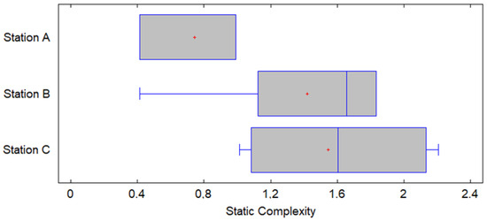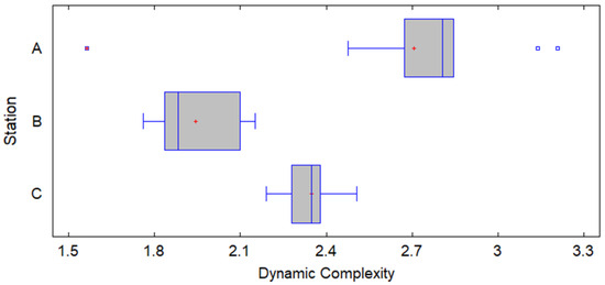 The hypothesis is also corroborated by the box plot, which suggests that the null hypothesis (HA0) could be rejected, given that there are evident differences in the medians and ranges of complexity between stations, especially between station A and station C (see Figure 9).