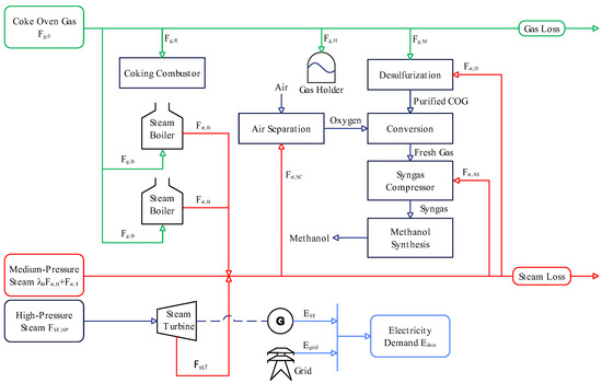 Figure 1 shows a schematic diagram of the multi-energy system in a gas-to-methanol process comprising a gas subsystem (green), a steam subsystem (red), and an electrical subsystem (blue). In this system, coke oven gas is the main by-product gas during the coal coking, and its supply () depends mainly on the coke production plan. Half of the gas () is returned to the coking combustor to provide heat for the coking chamber. The remaining portion of the gas is consumed in three parts: First, the gas flows into the methanol production line (). This gas undergoes desulfurization to remove organic sulfur and then enters the conversion subprocess, where the and unsaturated hydrocarbons in the gas react with pure oxygen in oxidation and steam conversion reactions to produce the effective components needed for synthetic methanol, such as , , and . The syngas compressor then transports these components to the synthesis subprocess, where methanol synthesis occurs under the presence of a catalyst. Most of the gas separated after synthesis is recycled to replenish fresh gas, with the remaining portion sent to a subsidiary for hydrogen extraction. This process is specific in that the syngas is distinguished by a high hydrogen concentration (about 70%). As a result, the hydrogen addition requirement is not considered, and the expense associated with hydrogen recovery is excluded from operating costs [27,28]. Second, the gas () is burned in a steam boiler using the combustion heat to warm deaerated water and generate medium-pressure steam (). Third, to ensure the safety and stability of the methanol production, the gas holder balances the surplus or shortage of gas in the system by regulating the storage and release of gas ().