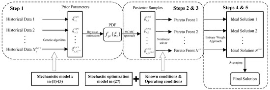 Due to structural errors in the mechanistic models, the “current” model estimated using the optimization algorithm may not accurately describe the true behavior of chemical equipment under “future” operating conditions. To address this issue, this subsection employs Bayesian estimation theory and the Markov Chain Monte Carlo (MCMC) approach to quantify model uncertainties by analyzing the differences between historical data and model predictions under varying operating conditions.