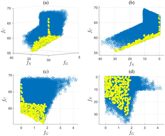 Multi-objective optimization problems often involve multiple conflicting objective functions, and there is usually no single solution that can simultaneously optimize all objectives. The Pareto front represents the set of all possible nondominated solutions in multi-objective optimization [41]. Assuming there are N optimal solutions denoted as , with three objective functions , , and , the corresponding objective function values for can be represented as