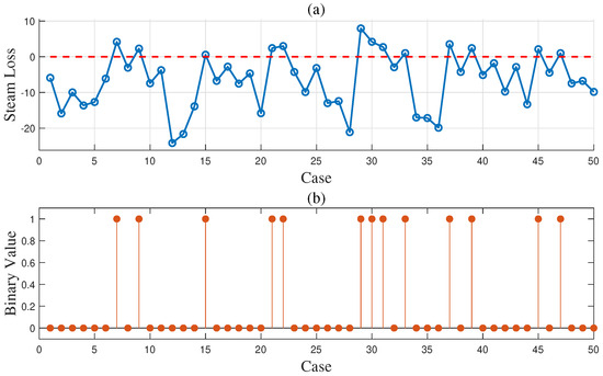 Here, x is the subscript index for the steam boiler model (B), desulfurization model (D), air separation model (), and l-th stage of syngas compressor model (). is the input variable of the model x, is the output variable of the model x, and are unknown parameters of the model x, where denotes the number of unknown parameters in the model x. is the operating condition vector that comprises multiple state variables, with reference ranges and nominal values presented in Table 2. The other variables in the mechanistic models have fixed values shown in Table 3 [2,28].