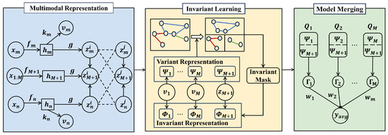 The first component involves the separation of common and modality-specific representations. For each modality, we use different heads to transform the original representation into common and modality-specific parts. A common loss and a mutual information loss are then combined to enhance the representation capabilities of the common representation and the distinctiveness of the modality-specific representation relative to the shared representation. This separation guides the model to learn more representative features for downstream tasks. Experiments demonstrate that both types of representations contribute to the model’s performance. The second component is invariant representation learning applied to both common and modality-specific representations. This approach endows our model with the ability to maintain robustness when faced with distribution shifts between training and testing data. The third component involves model merging through an ensemble of modality-level predictions. Unlike existing works [30] that train a single model on concatenated features from multiple modalities, we train a distinct model for each modality to capture modality-specific information and merge the results based on their importance to overall performance. This enables our model to learn and adjust its focus on relevant information.