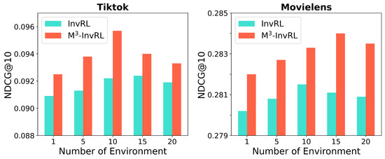To assess how the number of environments impacts the performance of -InvRL compared to InvRL, we conducted experiments on the Tiktok and Movielens datasets with varying numbers of environments. As illustrated in Figure 4, -InvRL consistently surpasses InvRL in NDCG@10 across different environment counts. A key advantage of -InvRL is its use of weighted averaging after adapting to each modality’s environment, which reduces the model uncertainty and enhances flexibility. In contrast, InvRL simply concatenates modes as a representation to learn invariant representations. By learning invariant representations separately from specific and common complete representations, -InvRL facilitates easier differentiation between environments. In the Tiktok dataset, using approximately 10 environments yields the best performance, as this number allows -InvRL to effectively distinguish between variant and invariant information, thereby enhancing recommendation quality. For the Movielens dataset, the performance improves with an increasing number of environments, suggesting that a larger number of environments is more suitable for this dataset.