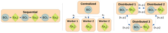 Alternatively, many costly problems can be performed cheaper and more efficiently using a parallel BO strategy that enables parallel experimentation, such as chemical experiments in a wet lab for drug discovery [4], multi-agent experiments [5], and autoML in a cluster [6]. Parallel BO can be achieved with a batch setting [7,8], where multiple experiments can be proposed to be carried out in parallel, including asynchronous execution [9]. These BO parallel approaches are centralized, with a single central node typically carrying out the bulk of the BO computation of updating the surrogate model and proposing the batch of experiments, which will be evaluated by many worker nodes. This hinders maintaining privacy in federated learning [10] and resource utilization when experiments are carried out with high-performance computing [11]. To solve this, BO can be adapted to work in an asynchronous decentralized fashion [12,13]. This fully distributed workflow enables the experiment to be carried out even if there is a partial failure in the distributed network since data is shared asynchronously and new experiments can be proposed independently. Figure 1 compares them.