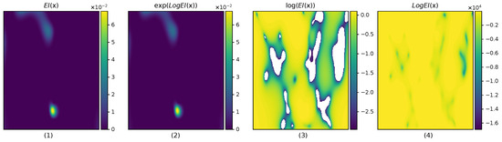 A 2D example problem to show the numerical instabilities of the expected improvement . It shows different computations of the using a double-precision floating point. From left to right, it showcases the inaccuracy of compared to : (1) shows the default , (2) visually shows that computes the correct quantity of , (3) shows the inaccuracies of when computing , with unusable white regions representing minus infinite values resulting from being numerically zero, and (4) shows that implementation is capable of representing values much lower than without numerical issues.